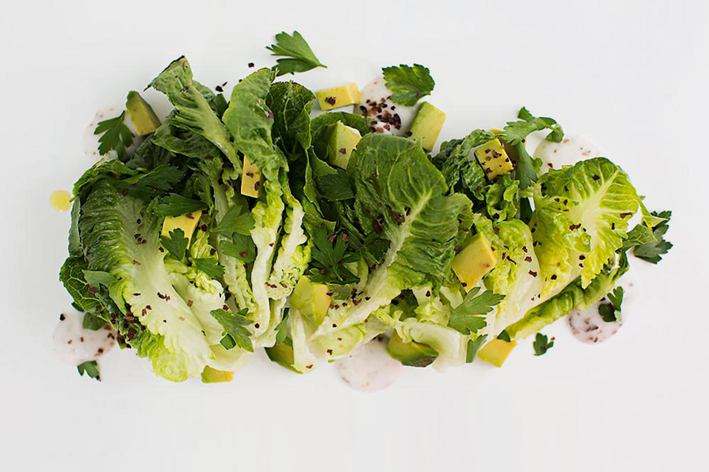 Slice romaine hearts on the bias. In a large bowl, gently toss lettuce with the coconut dressing, making sure to fully coat leaves for a wedge-style salad. Garnish with chopped olives and dulse. Try tearing leaves and tossing all ingredients together for a more traditional Caesar salad presentation.
